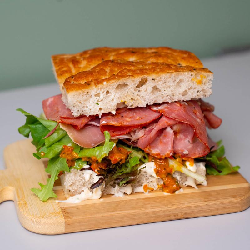 Rosemary proscuitto coto, spicy capicola, soppressata roasted sweet pepper pesto, mozzarella, roasted garlic aioli on herb focaccia.