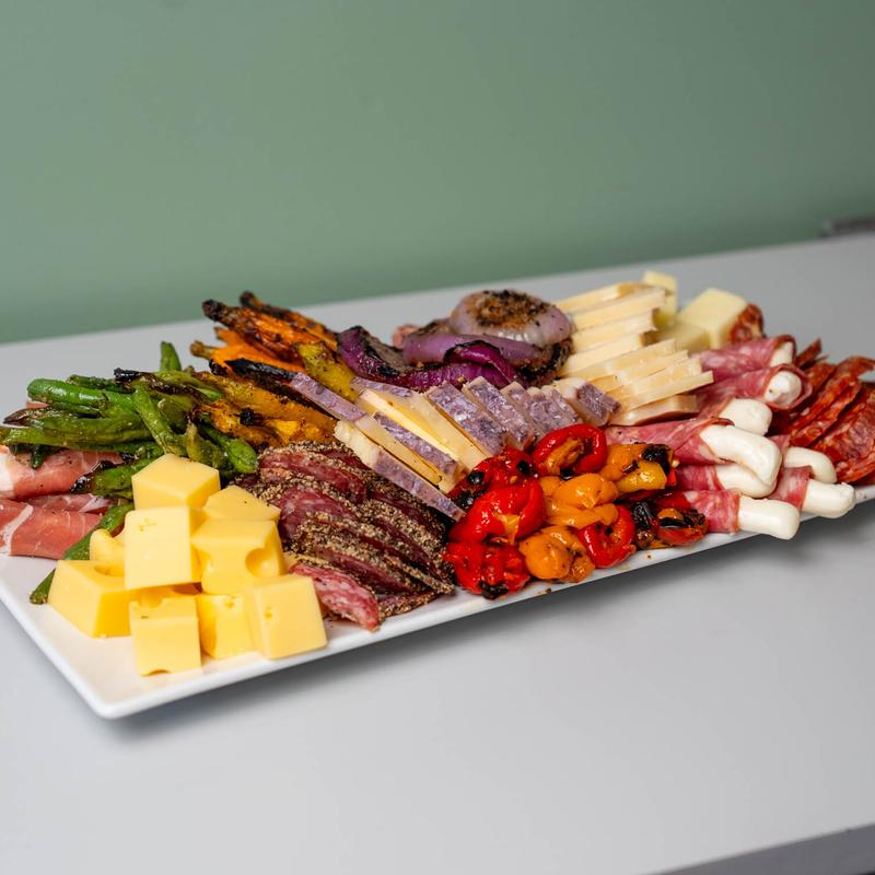 Half $75.00 | Full $145.00 • Zucchini, summer squash, eggplant, roasted sweet pepper tomato sauce, basil arugula pesto.